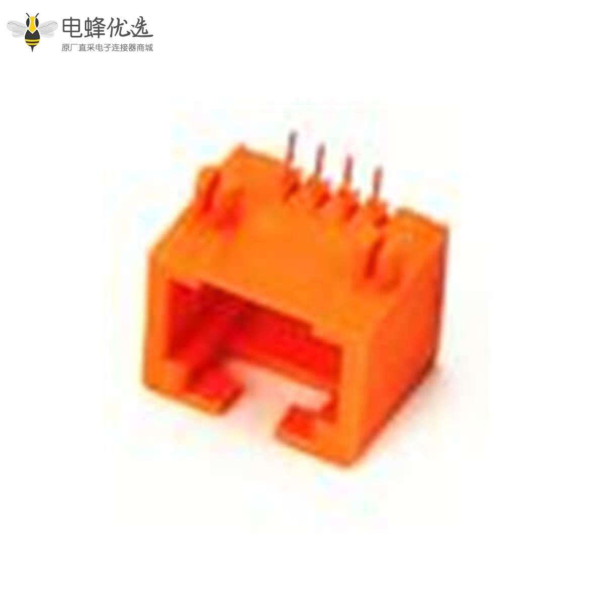 - RJ45连接器,母座,PCB板,8P8C,1*1,单层,单口,弯式,非屏蔽,不带弹片,不带灯,不带滤波器,全塑壳,橙色;