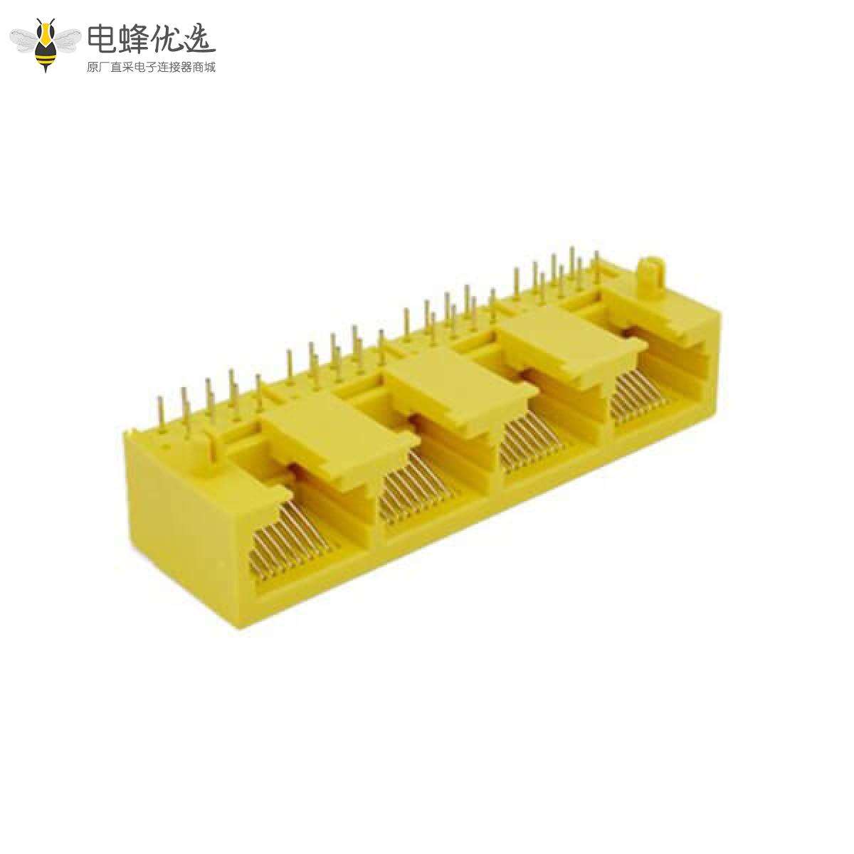 - RJ45连接器,母座,PCB板,8P8C,1*4,单层,4口,弯式,非屏蔽,不带弹片,不带灯,不带滤波器,全塑壳,黄色;
