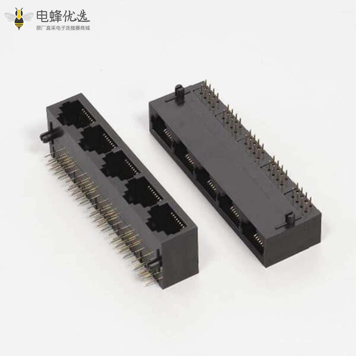 - RJ45连接器,母座,PCB板,8P8C,1*5,单层,五口,弯式,非屏蔽,不带弹片,不带灯,不带滤波器,塑料壳,黑色;