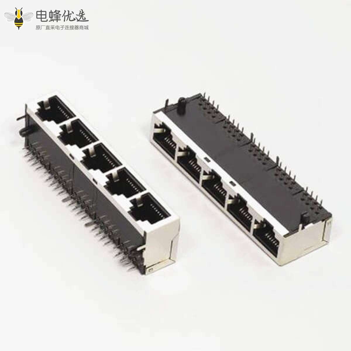 - RJ45连接器,母座,PCB板,8P8C,1*5,单层,五口,弯式,屏蔽,带弹片,不带灯,不带滤波器,铜壳,镀镍;