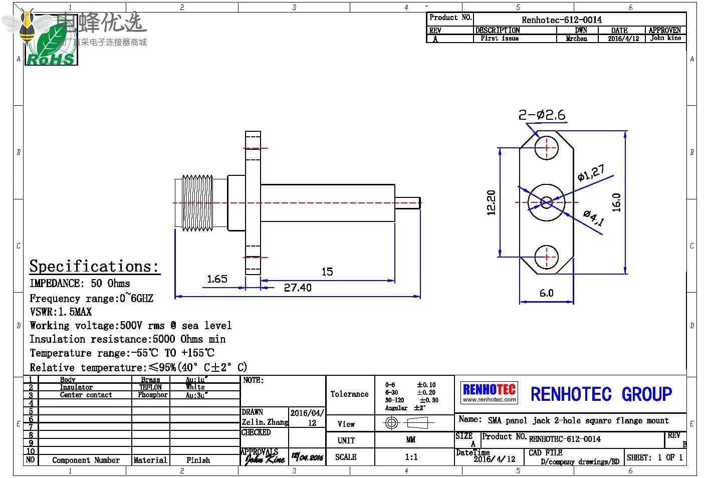 sma系列射频同轴连接器 2孔法兰直式母头面板安装