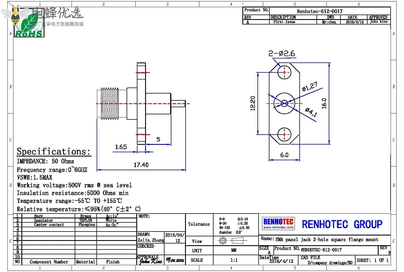 接RG142,RG405线缆时为170 V rms - 中心接触电阻:≦ 6.0mΩ (Milliohms max.)