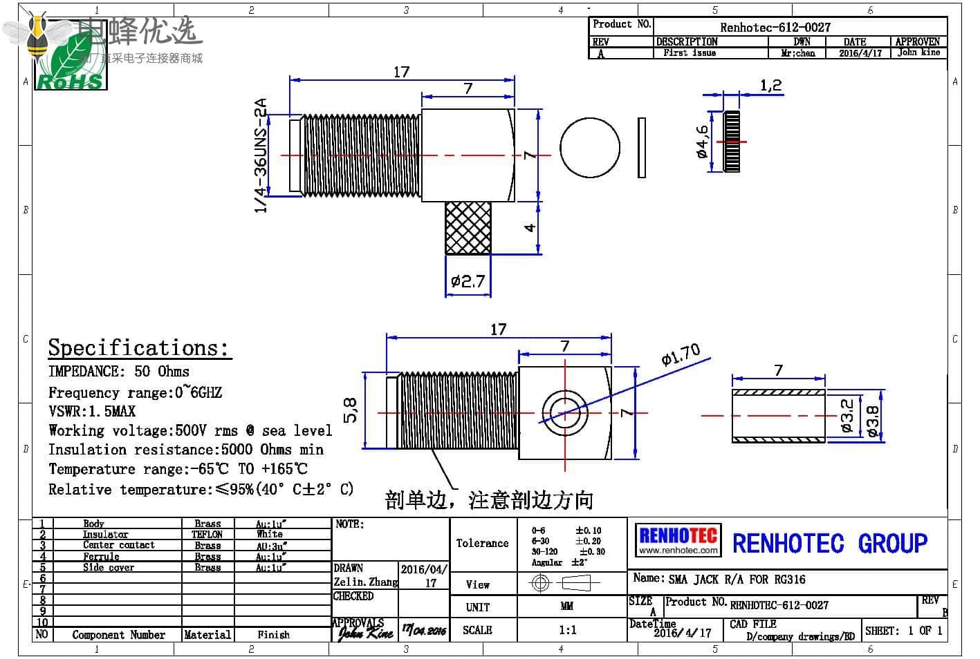 - sma连接器,同轴线缆,压接,弯式,母头,RG316;
