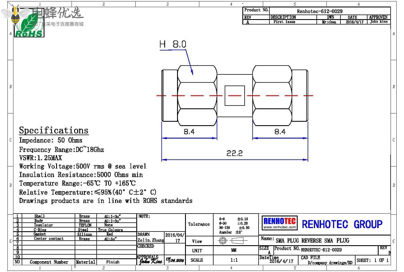 接RG142,RG405线缆时为170 V rms - 中心接触电阻:≦ 6.0mΩ (Milliohms max.)