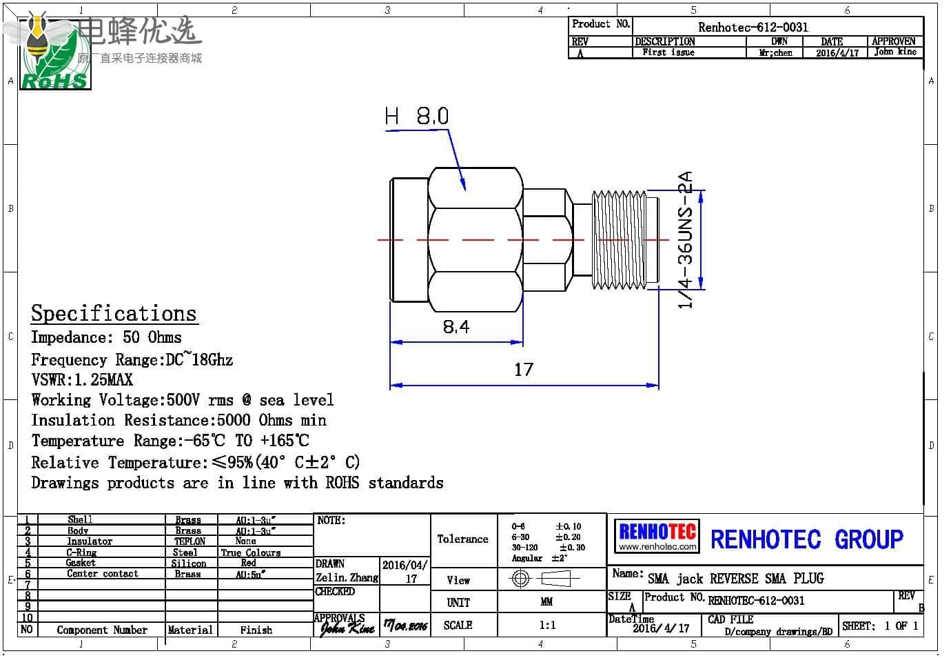 接RG142,RG405线缆时为170 V rms - 中心接触电阻:≦ 6.0mΩ (Milliohms max.)