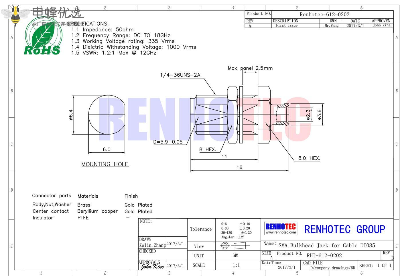 - sma连接器,穿墙,焊接,直式,母头,同轴线缆,UT085;