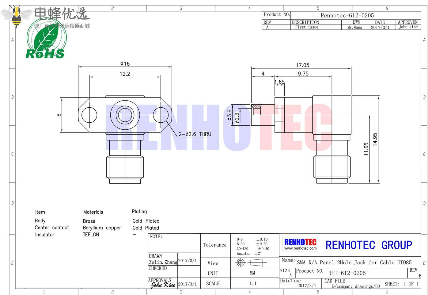 - sma连接器,弯式,母头,同轴线缆,UT085,2孔法兰,面板安装,同轴线缆;