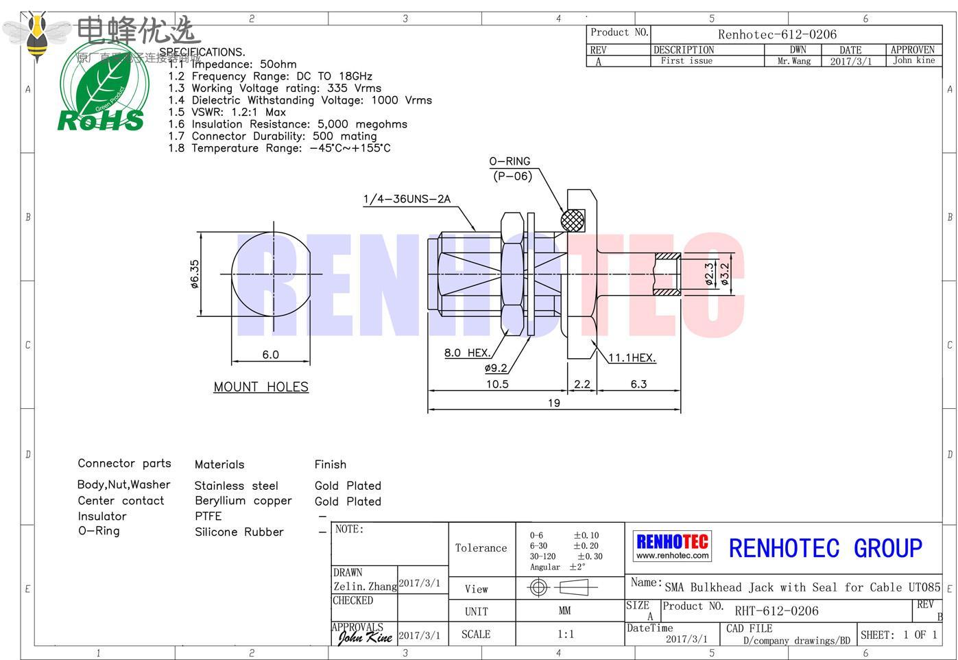 - sma连接器,穿墙,焊接,直式,母头,同轴线缆,UT085,防水;