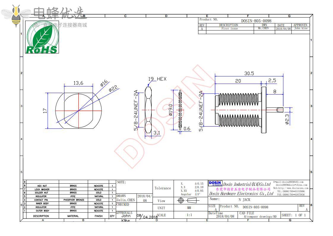 中心接触电阻: ≦ 1.0 mΩ (Milliohms max.)