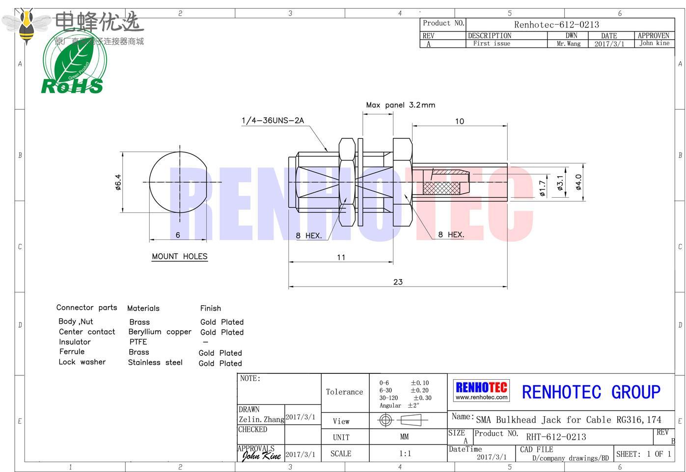 - sma连接器,直式,母头,同轴线缆,穿墙,同轴线缆, RG316, RG174;