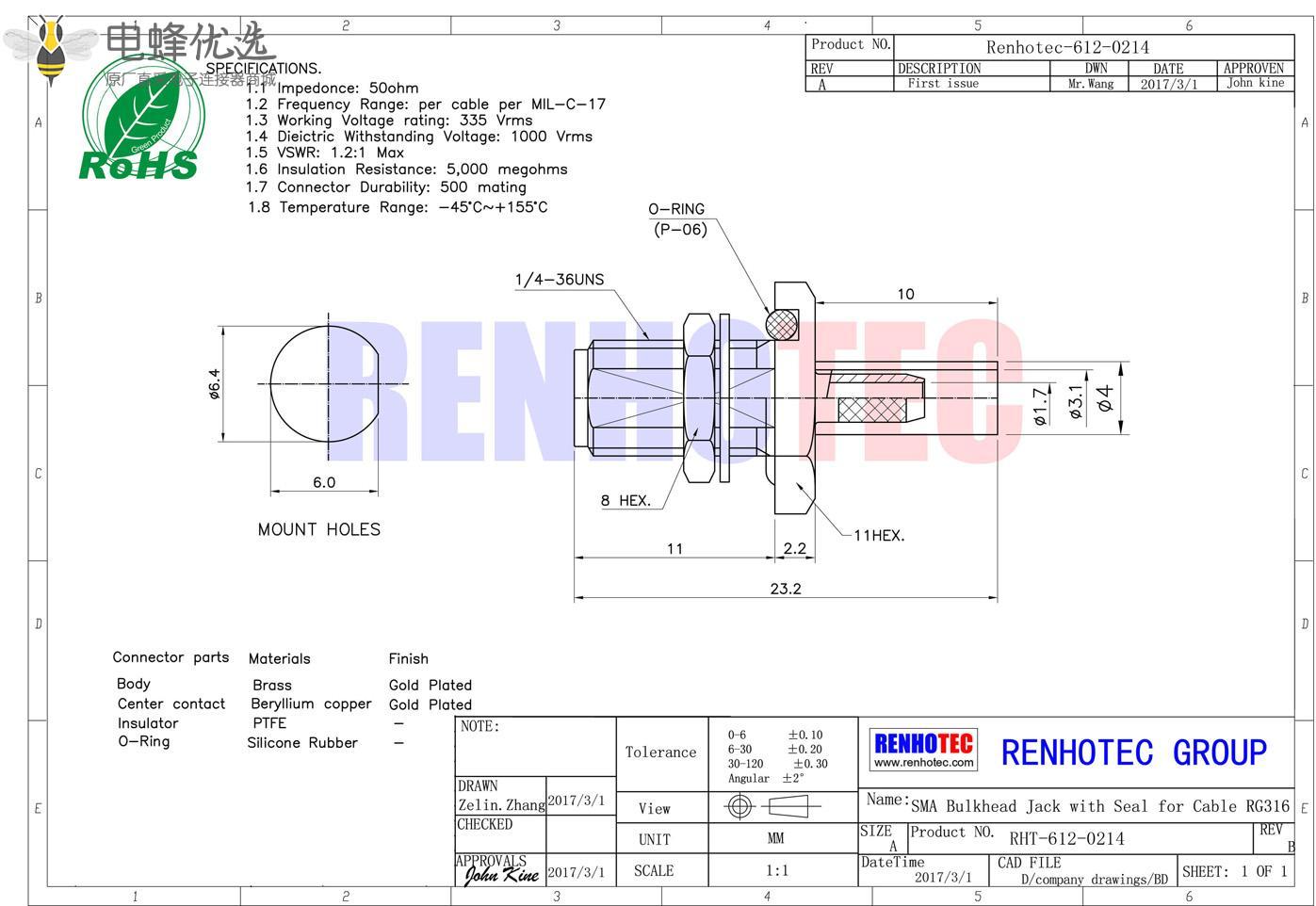 接RG142,RG405线缆时为170 V rms - 中心接触电阻:≦ 6.0mΩ (Milliohms max.)