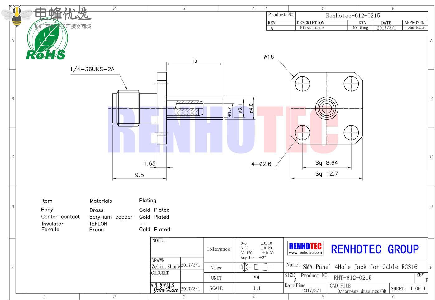 - sma连接器,直式,母头,同轴线缆,RG316,4孔法兰,面板安装,同轴线缆,压接;