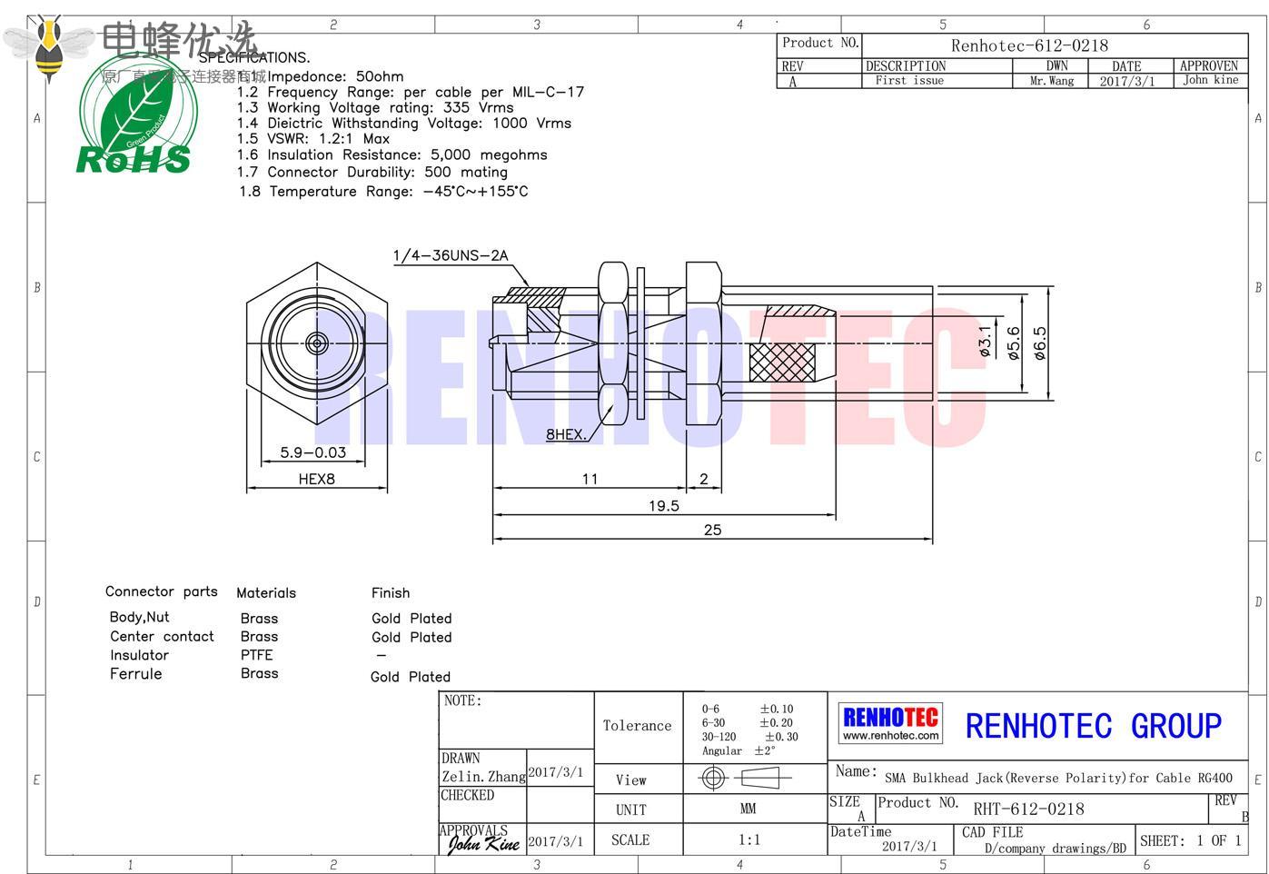 - sma连接器,同轴线缆,压接,直式,插座,RG400,反极;