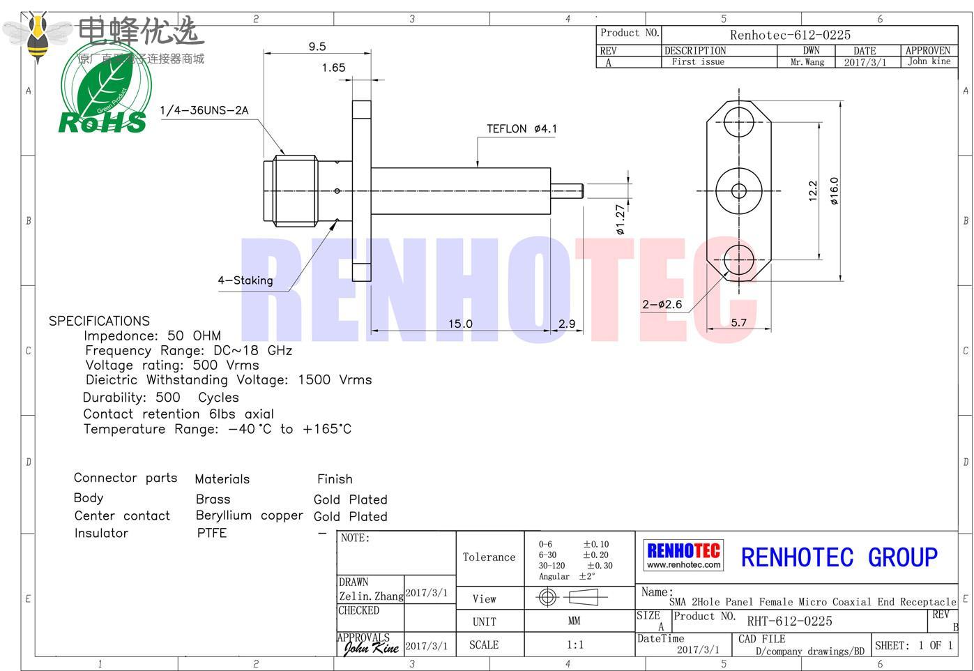 接RG142,RG405线缆时为170 V rms - 中心接触电阻:≦ 6.0mΩ (Milliohms max.)