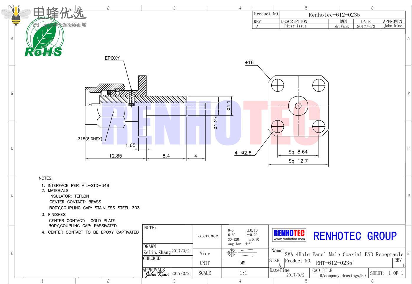 - sma连接器, 面板安装,直式,公头,4孔法兰,延长铁氟龙,树脂灌胶;