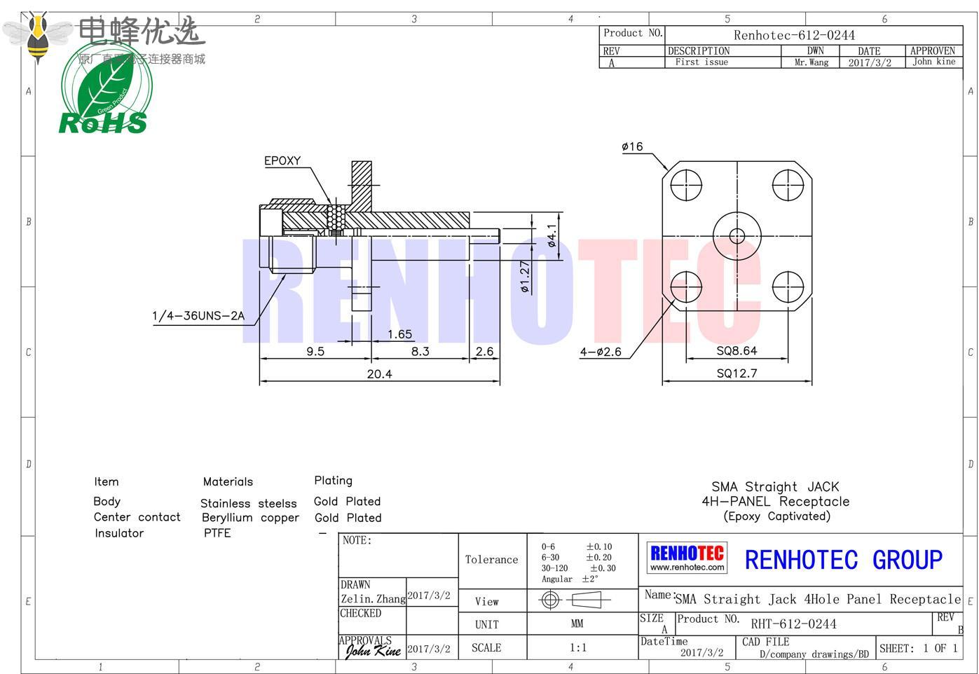 - sma连接器, 面板安装,直式,母头,4孔法兰, 树脂灌胶, 延长铁氟龙;