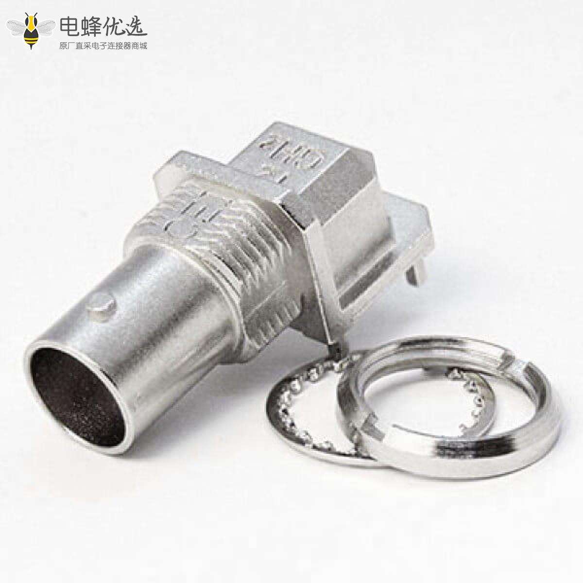 - BNC连接器, 母头, 弯式, 穿墙插板式, 75欧姆, 镀镍;