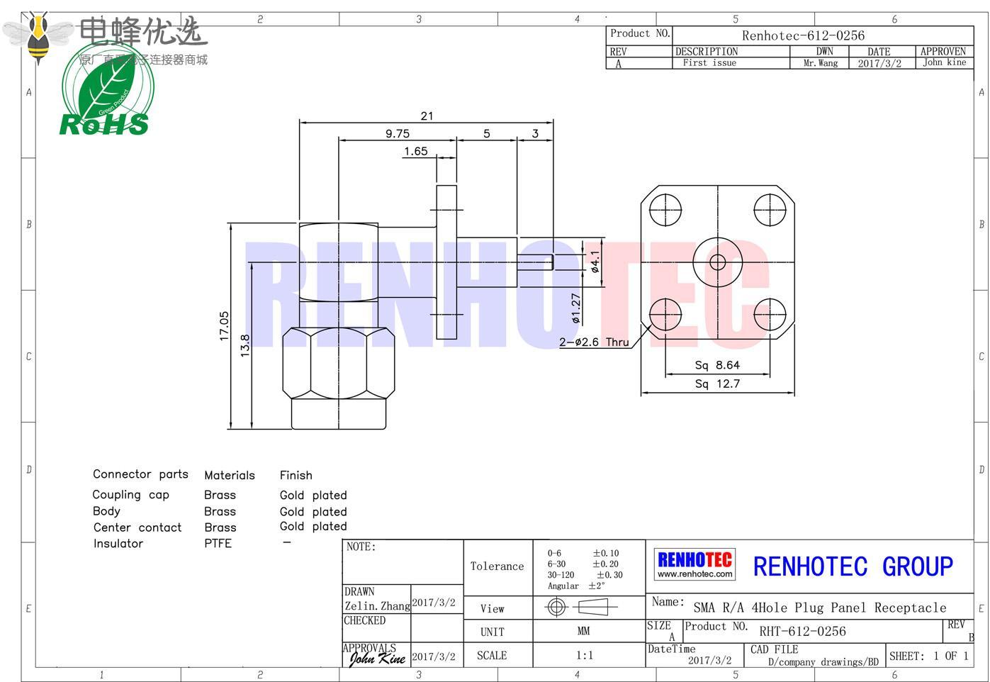 接RG142,RG405线缆时为170 V rms - 中心接触电阻:≦ 6.0mΩ (Milliohms max.)