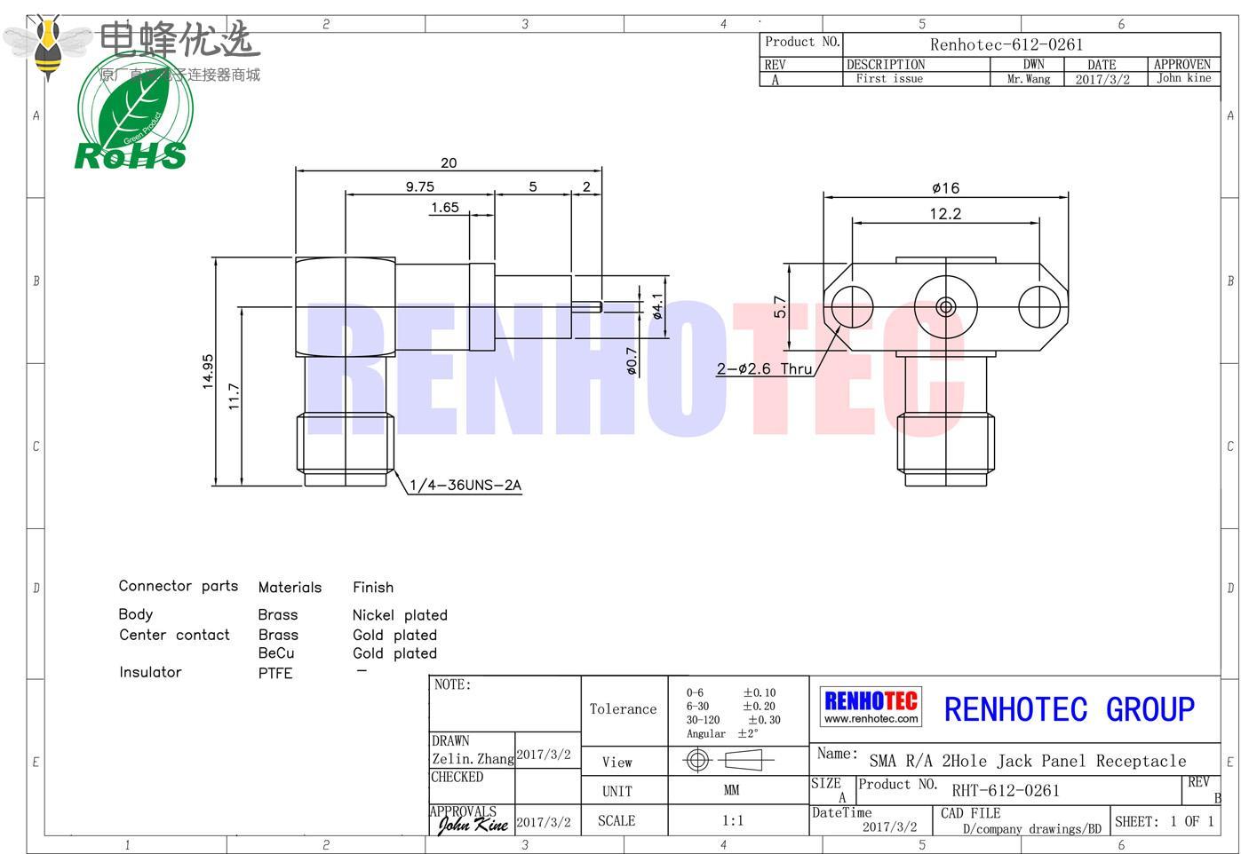 接RG142,RG405线缆时为170 V rms - 中心接触电阻:≦ 6.0mΩ (Milliohms max.)
