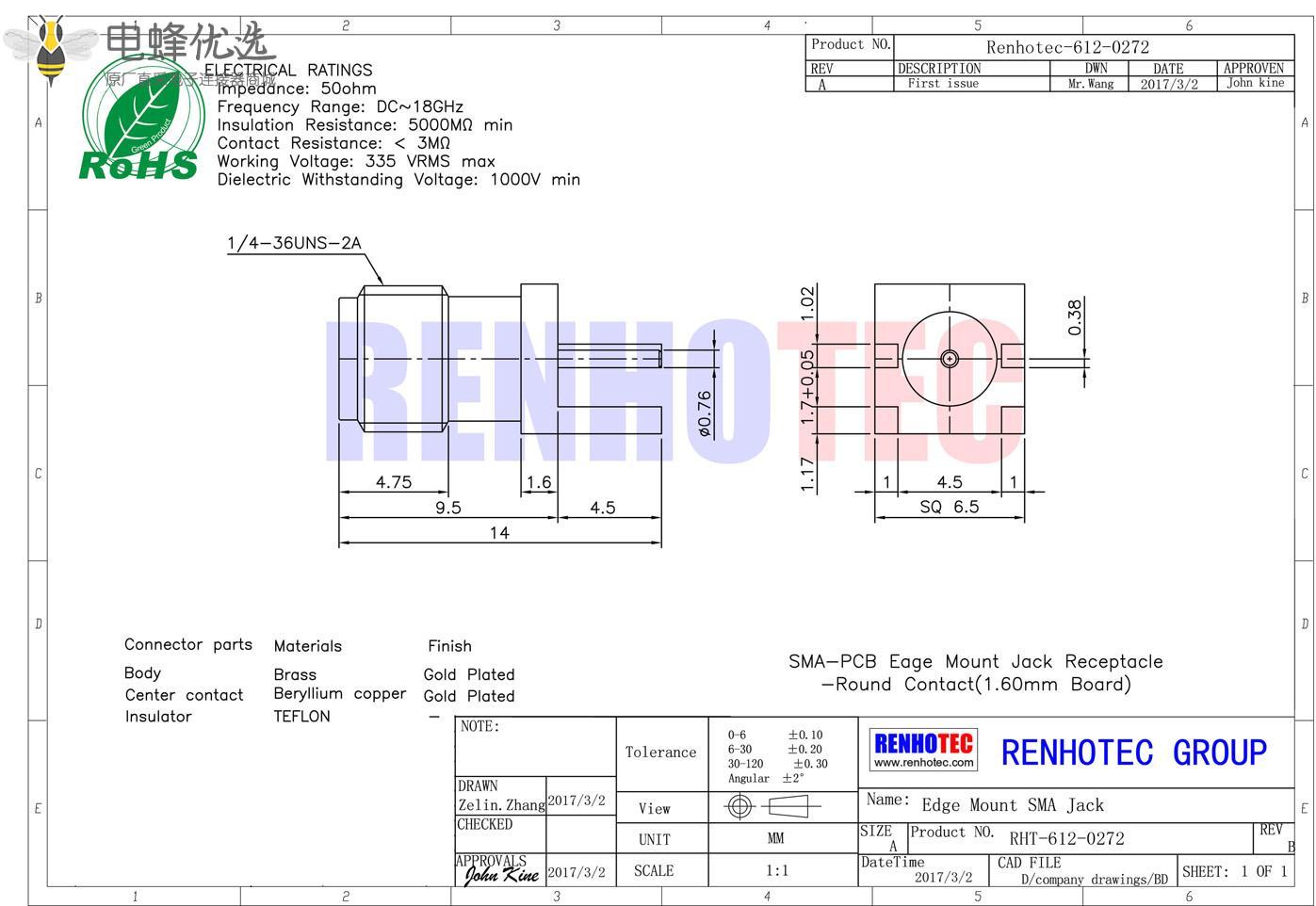 接RG142,RG405线缆时为170 V rms - 中心接触电阻:≦ 6.0mΩ (Milliohms max.)