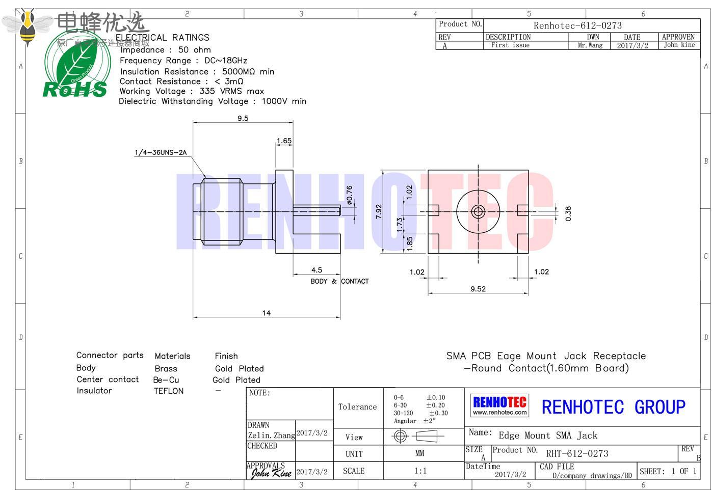 接RG142,RG405线缆时为170 V rms - 中心接触电阻:≦ 6.0mΩ (Milliohms max.)