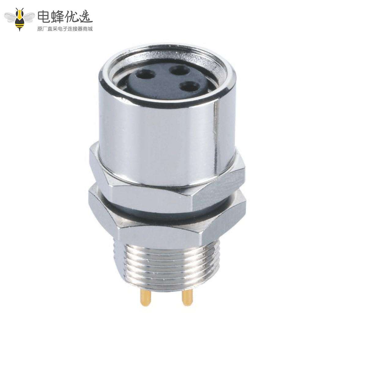 - M8, A编码, 3芯,板端插座, 母, 直头, 接PCB板, 后锁板;