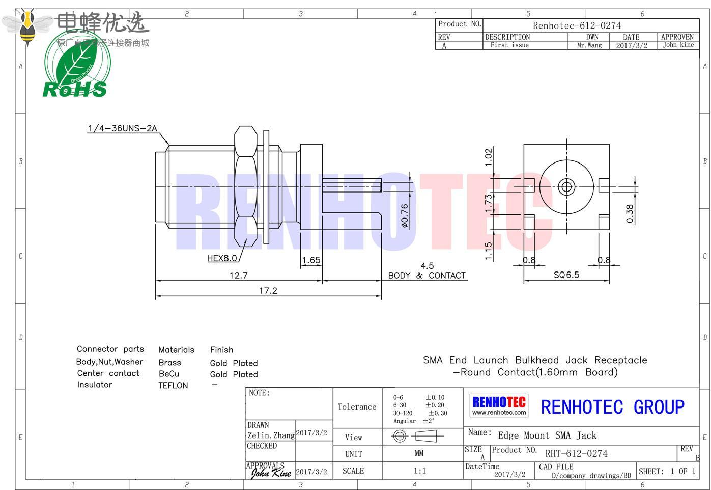 接RG142,RG405线缆时为170 V rms - 中心接触电阻:≦ 6.0mΩ (Milliohms max.)