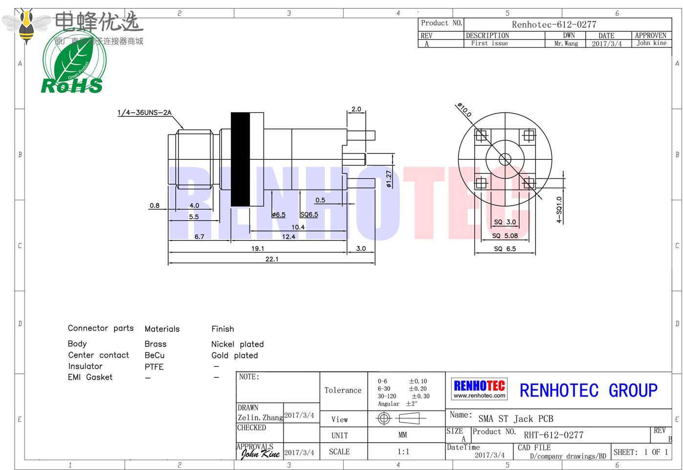 接RG142,RG405线缆时为170 V rms - 中心接触电阻:≦ 6.0mΩ (Milliohms max.)