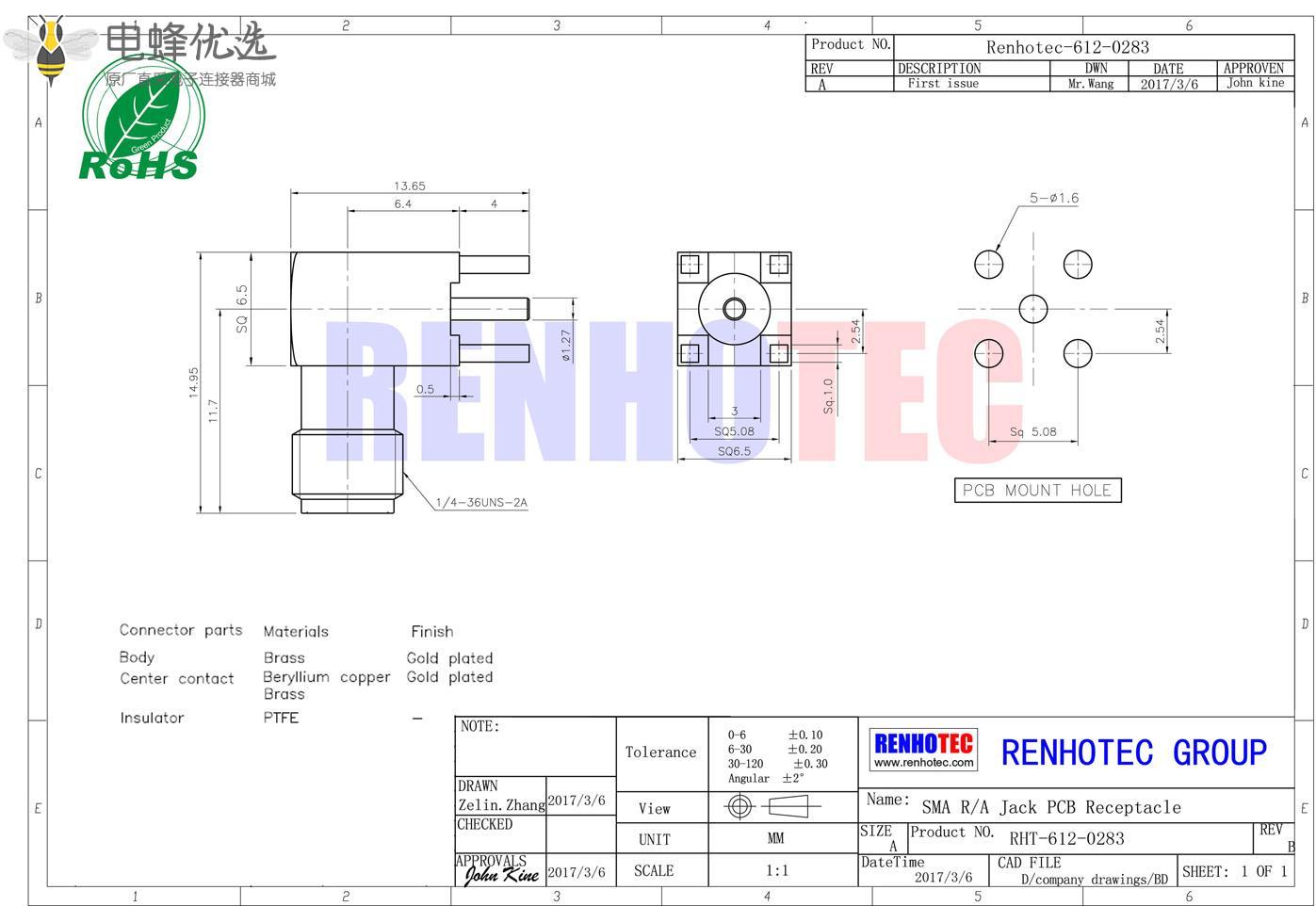 接RG142,RG405线缆时为170 V rms - 中心接触电阻:≦ 6.0mΩ (Milliohms max.)