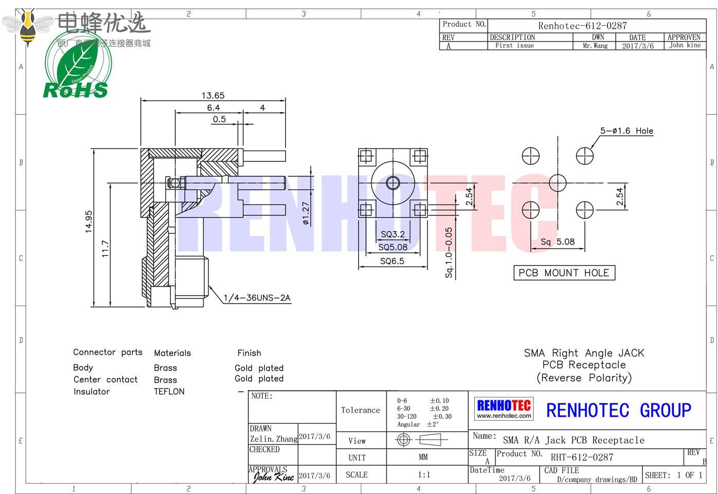接RG142,RG405线缆时为170 V rms - 中心接触电阻:≦ 6.0mΩ (Milliohms max.)