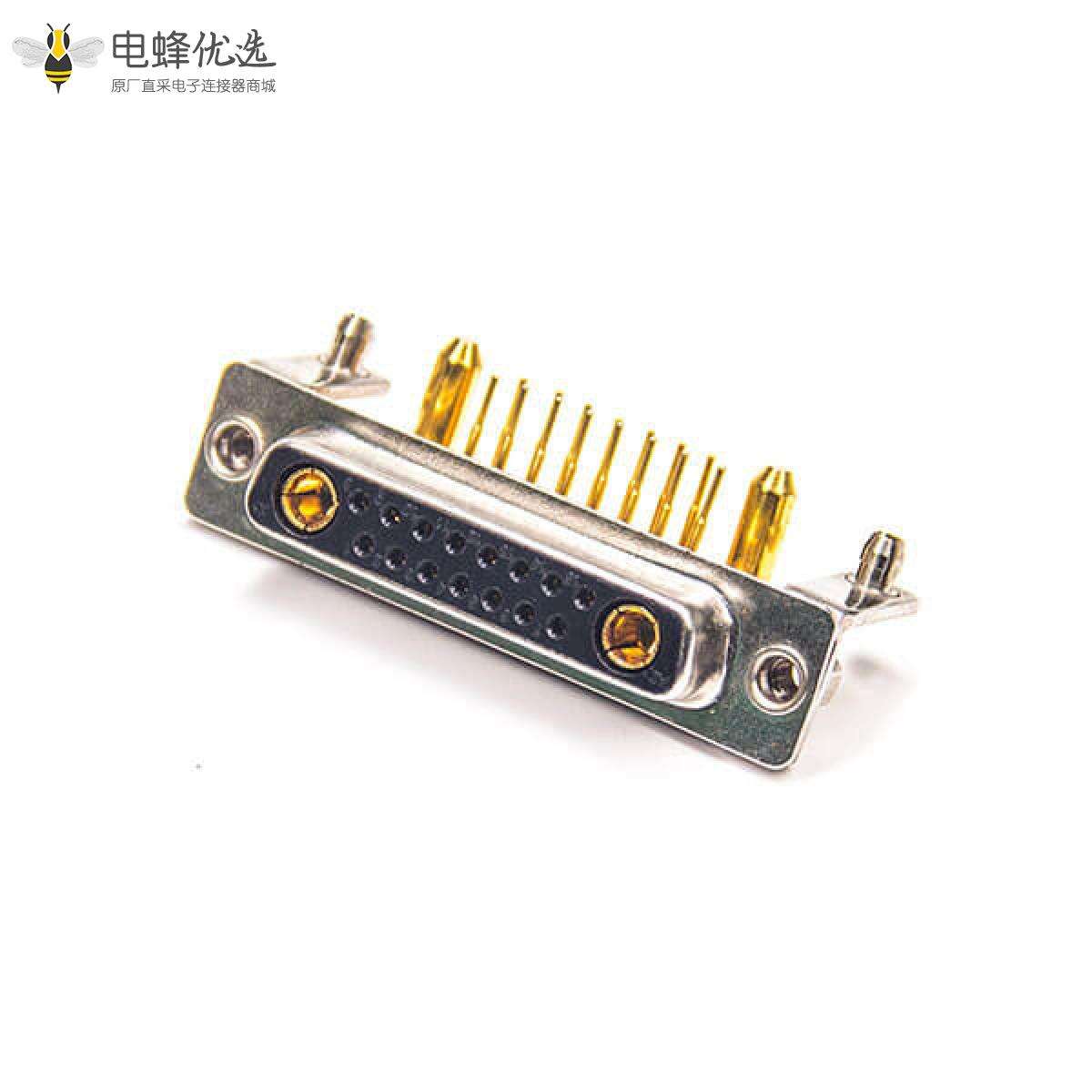 - 混合型D-sub连接器,插座,17W2,2排,单端口,直角型,车针,镀金,通孔,面板安装,无螺纹,IP20,无滤波;