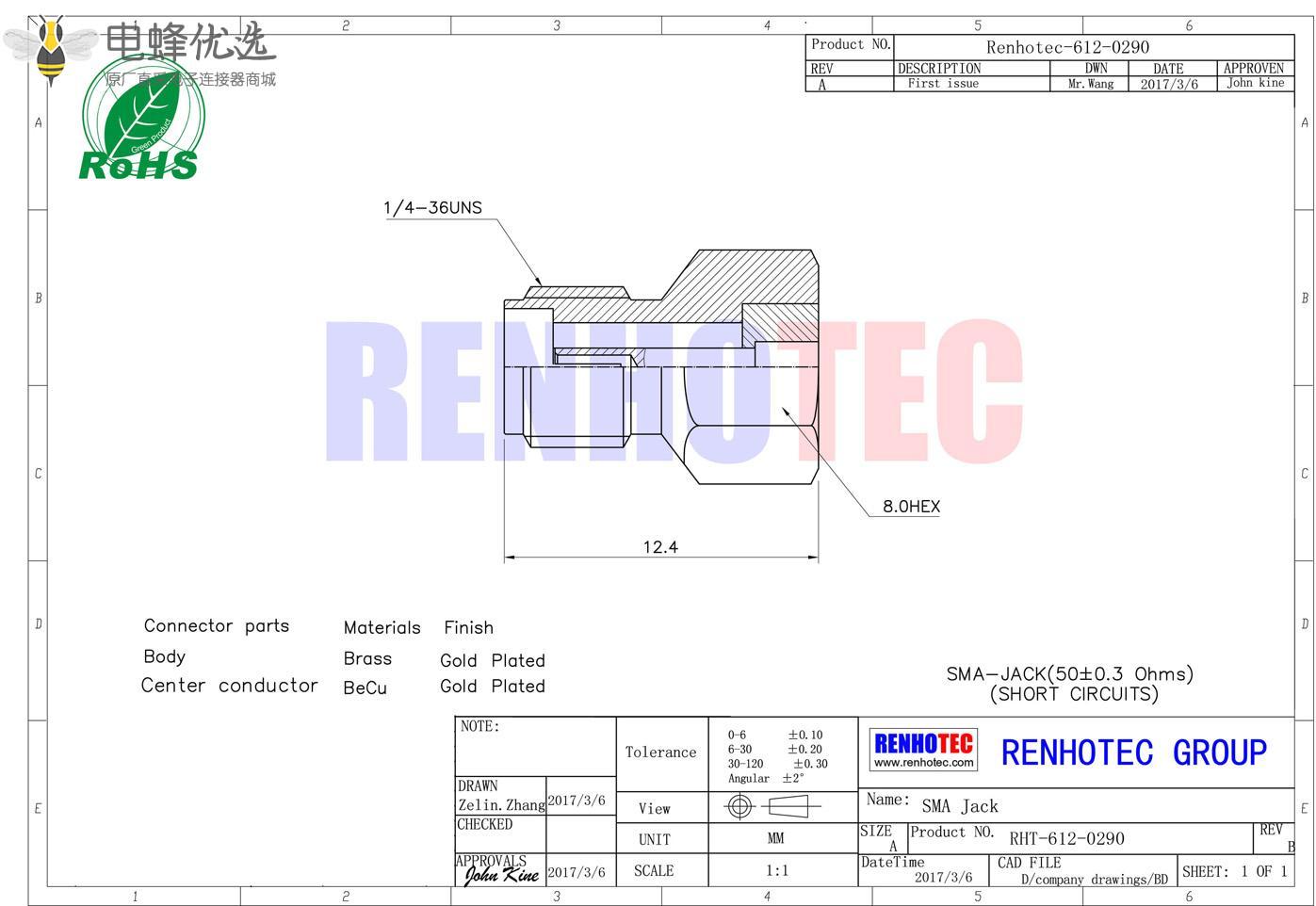 接RG142,RG405线缆时为170 V rms - 中心接触电阻:≦ 6.0mΩ (Milliohms max.)