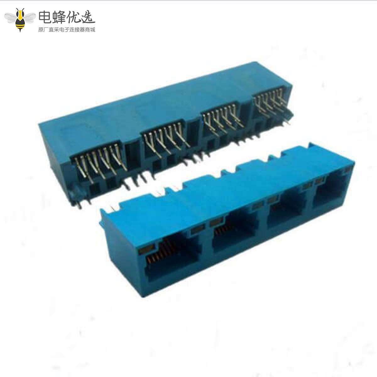 - RJ45连接器,插座,8P8C,4口,1*4,单层,弯式90°,镀金,插孔,PCB板安装,非屏蔽,不带灯,不带滤波器,不带POE,不防水;