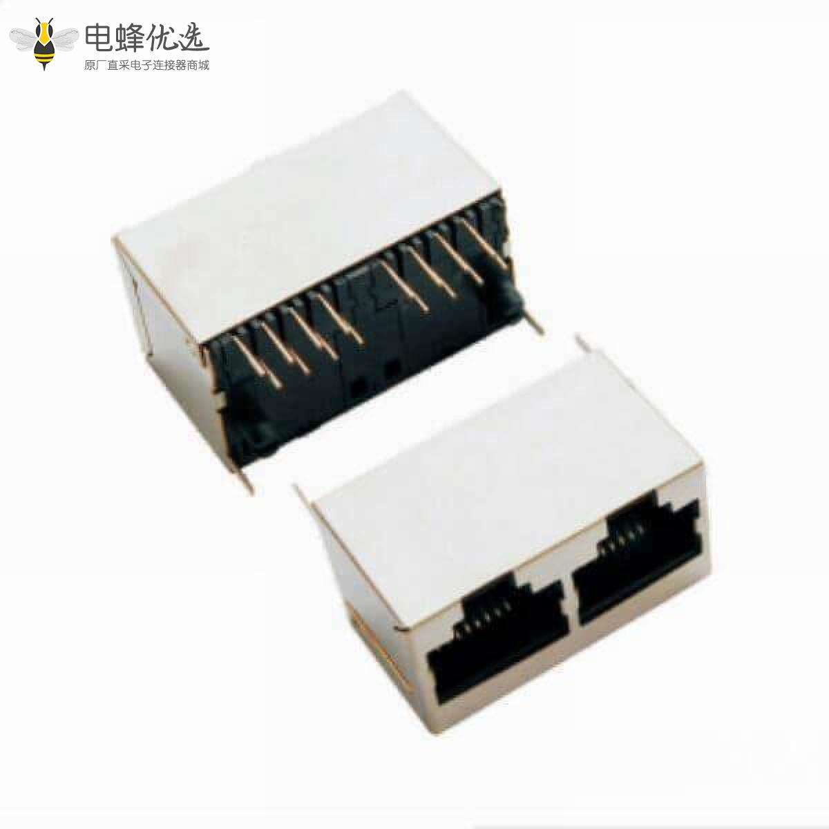 - RJ45连接器,插座,8P8C,2口,1*2,单层,直式180°,镀金,插孔,PCB板安装,屏蔽,不带灯,不带滤波器,不带POE,不防水;