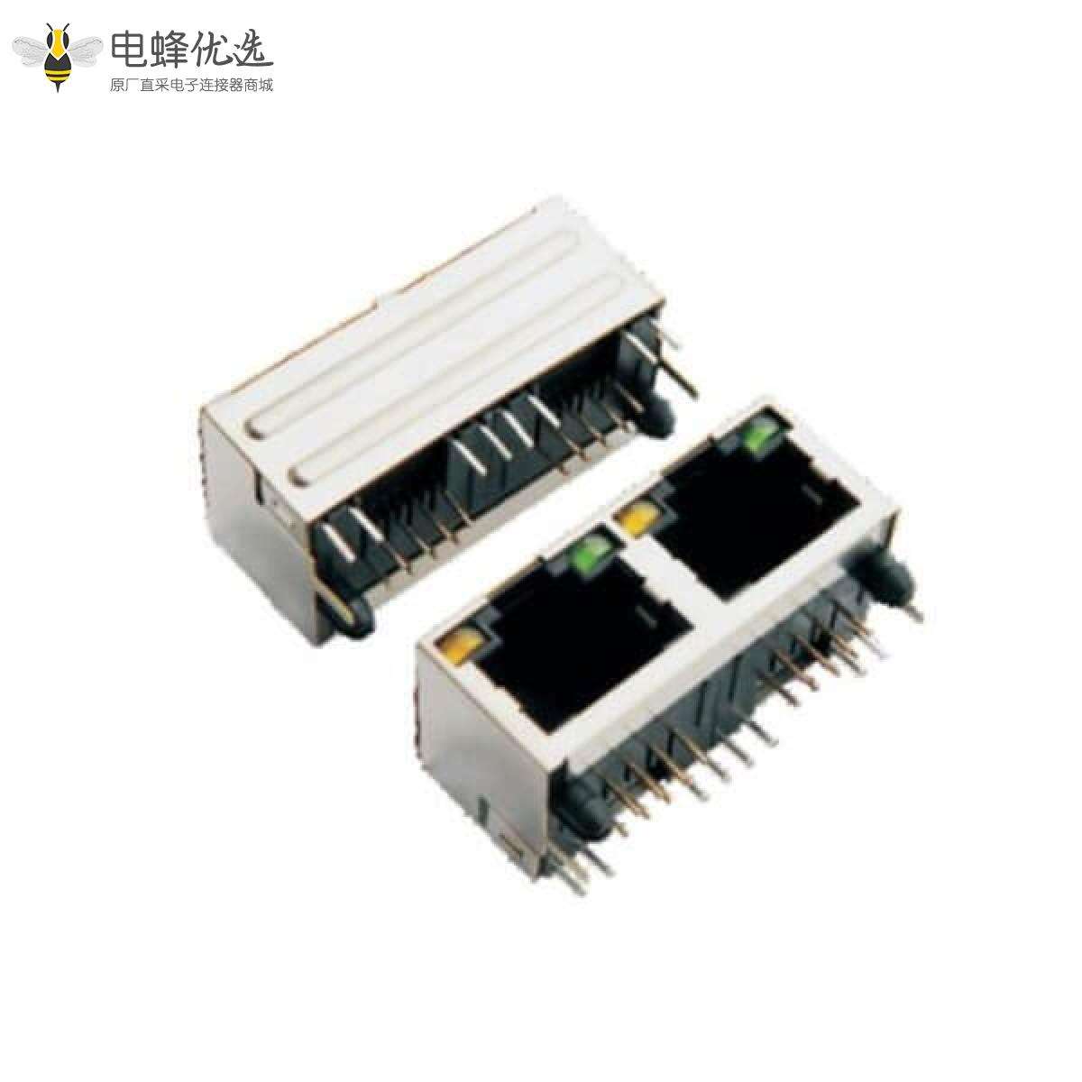 RJ45插座带灯左黄右绿90度屏蔽双口单层网络连接器
