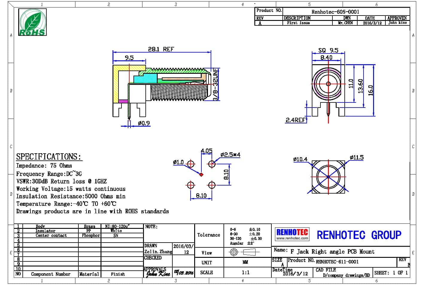 f连接器,pcb板,母头,75欧,穿墙,弯式;