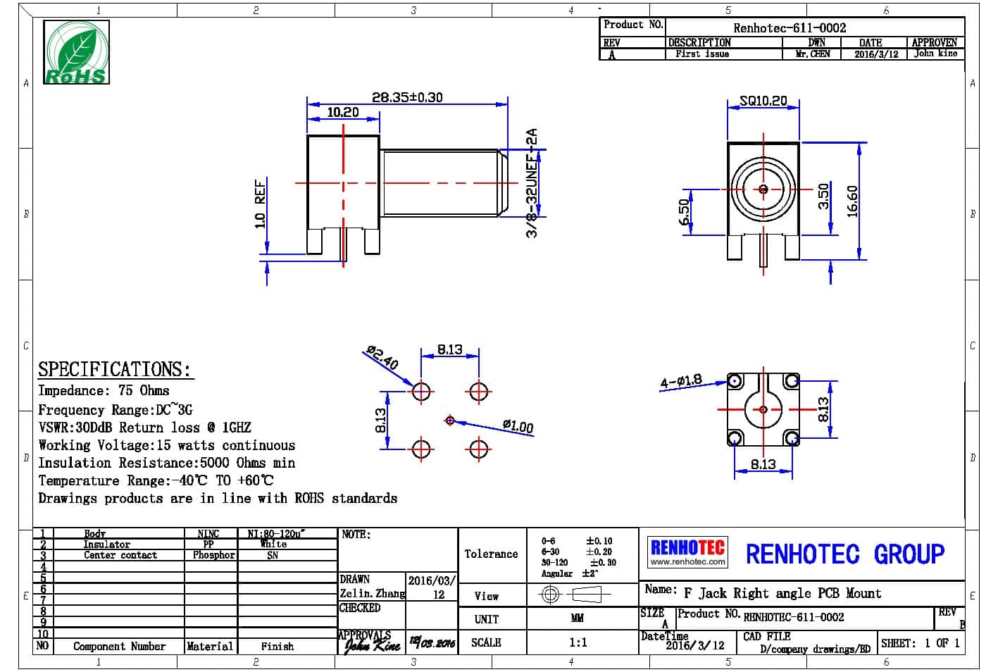 - 中心接触电阻: ≦ 10 mΩ (Milliohms max.)
