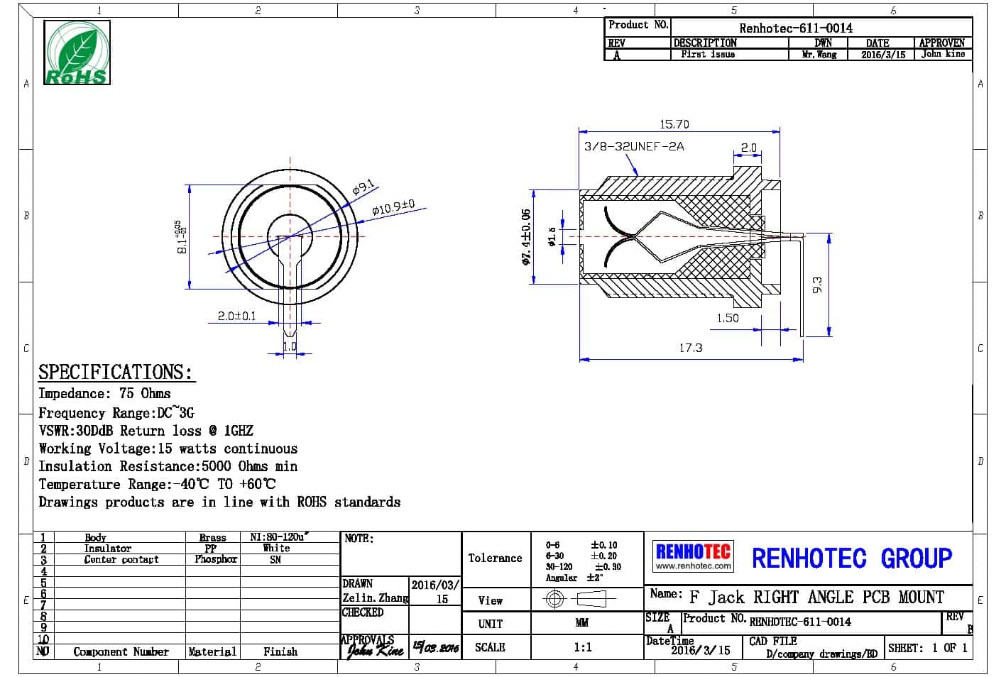 - 中心接触电阻: ≦ 10 mΩ (Milliohms max.)