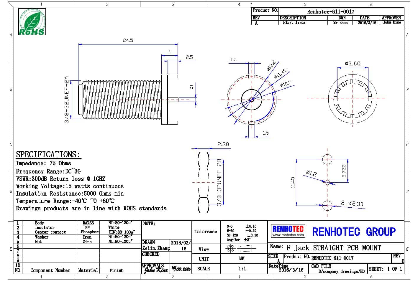 - 阻抗:75 ohm