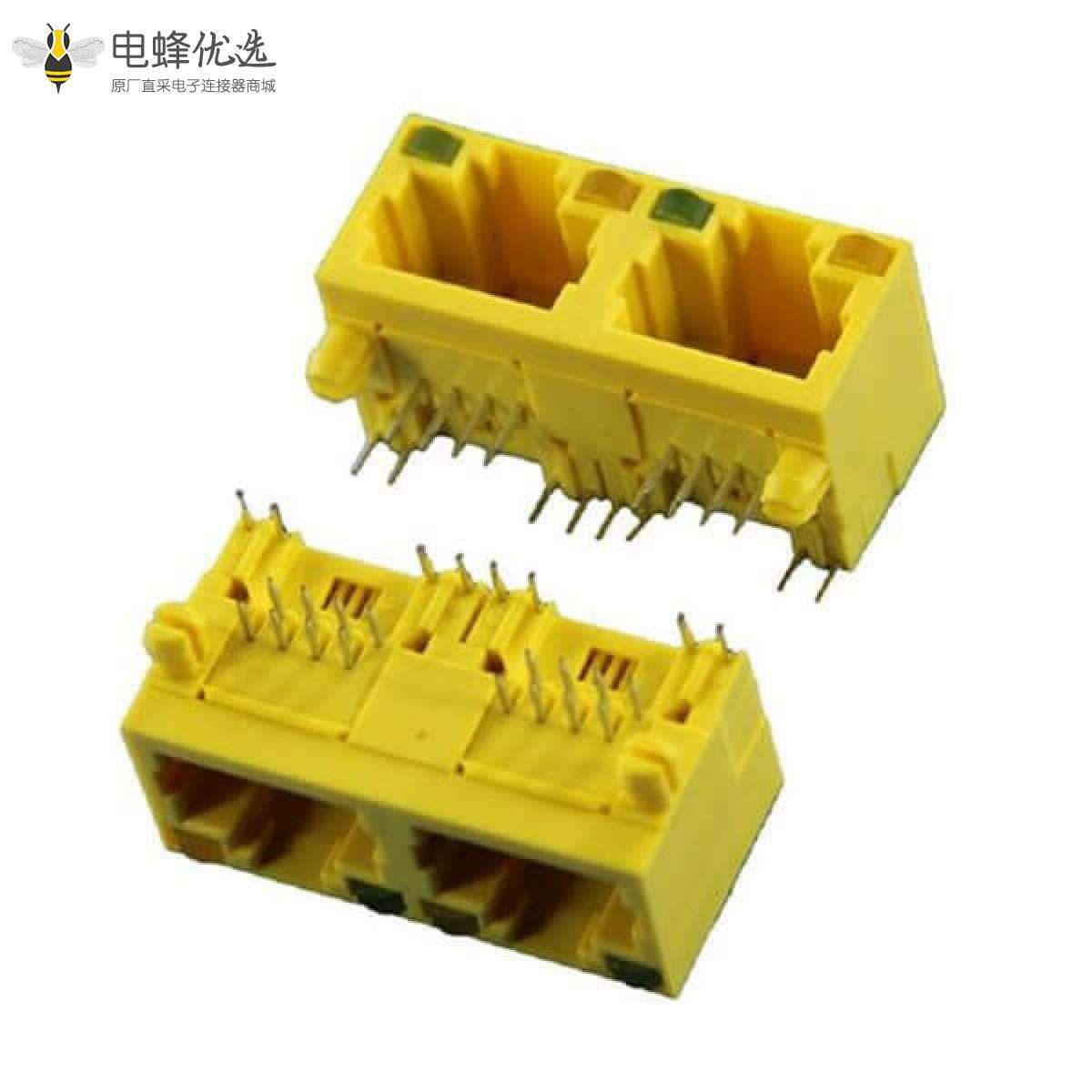 - RJ45连接器,插座,8P8C,2口,1*2,单层,弯式90°,镀金,插孔,PCB板安装,非屏蔽,带灯,不带滤波器,不带POE,不防水;