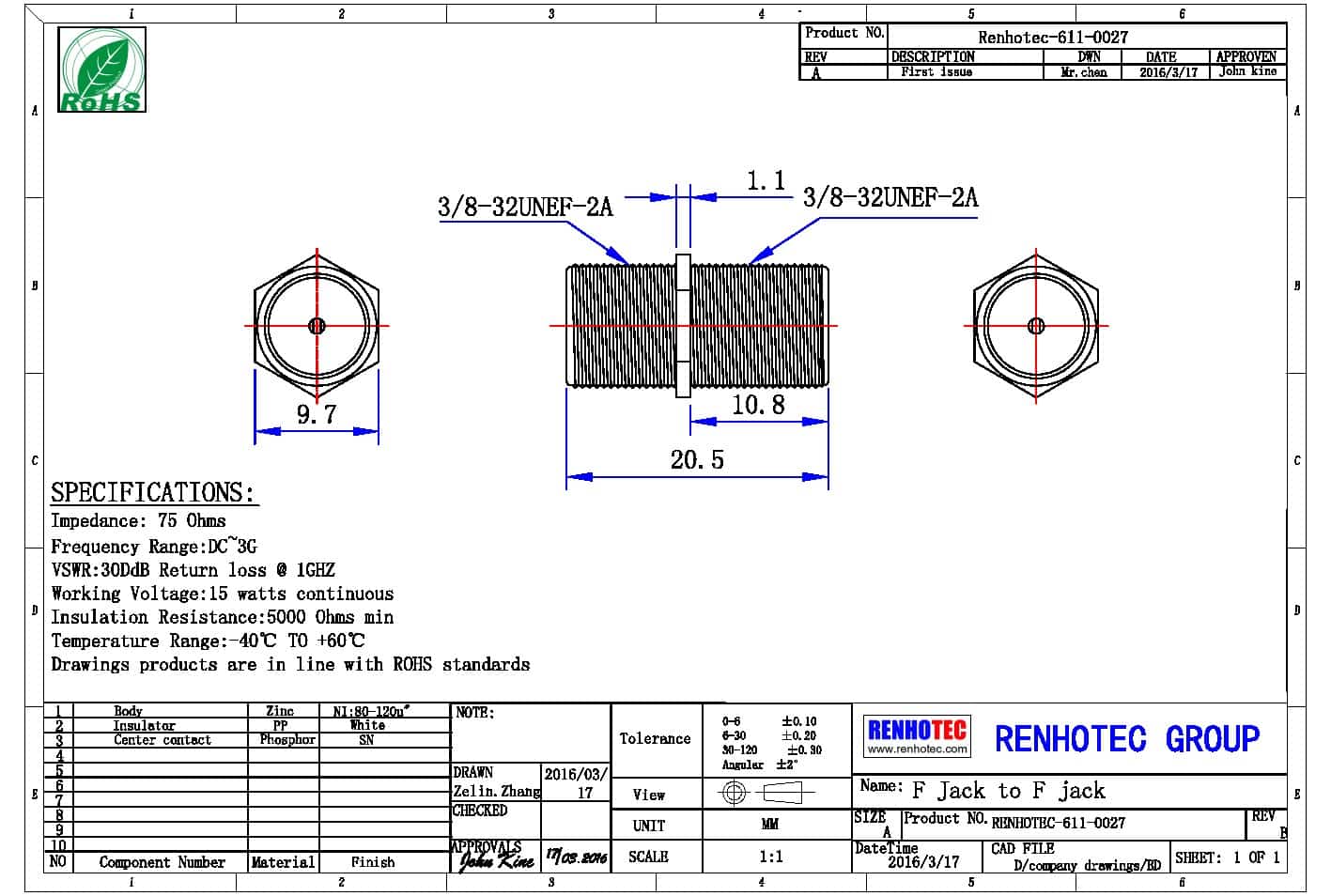 - 阻抗:75 ohm