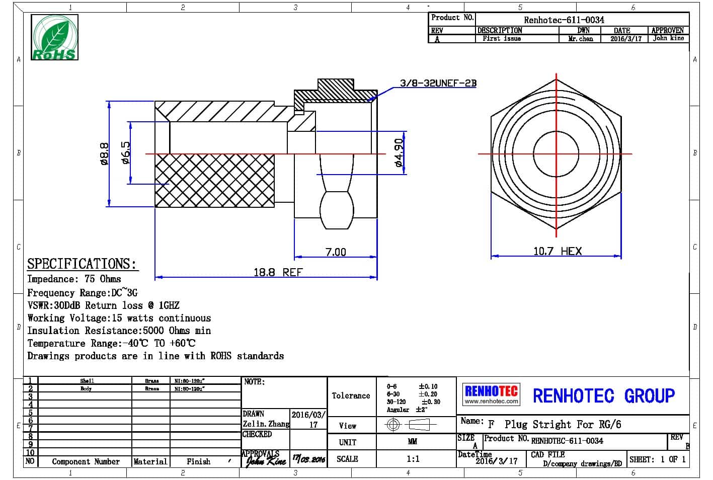 - f连接器,同轴线缆,公头,75欧,直式,RG6;