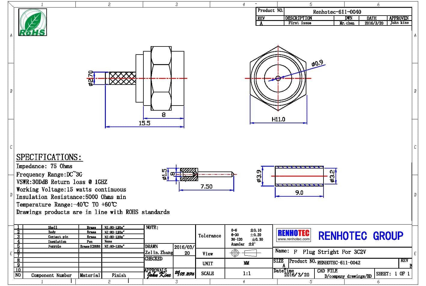 - 阻抗:75 ohm