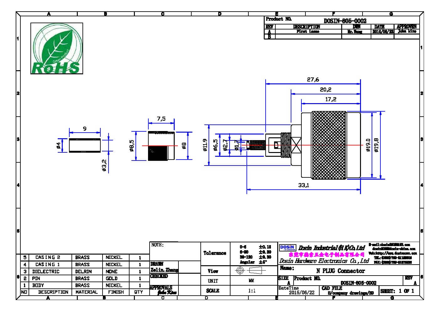 - 高性能连接器,频率范围达0到11GHz,阻抗50欧姆;