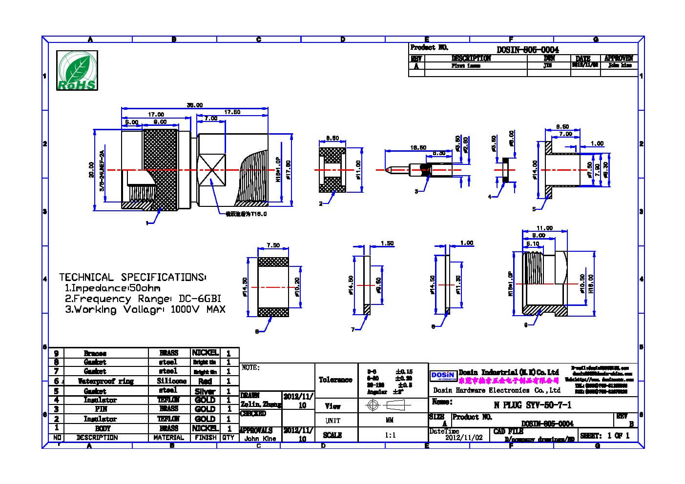 - 高性能连接器,频率范围达0到11GHz,阻抗50欧姆;
