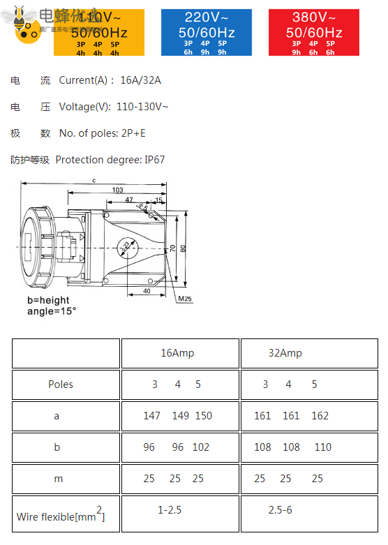 3芯,16A,110V-130V,明装插座,IP67,黄色;