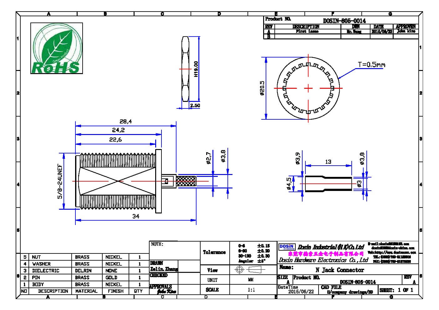 - 中心接触电阻: ≦ 1.0 mΩ (Milliohms max.)