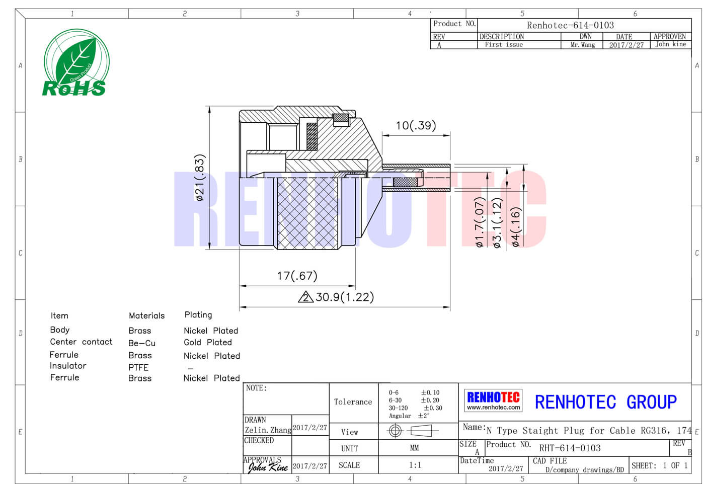 | Center Contact | Be-Cu | Gold Plated | |