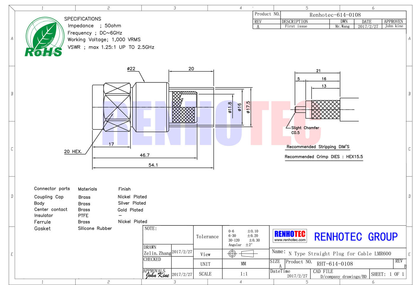 - n连接器,同轴线缆,公头,50欧,直式,LMR600;