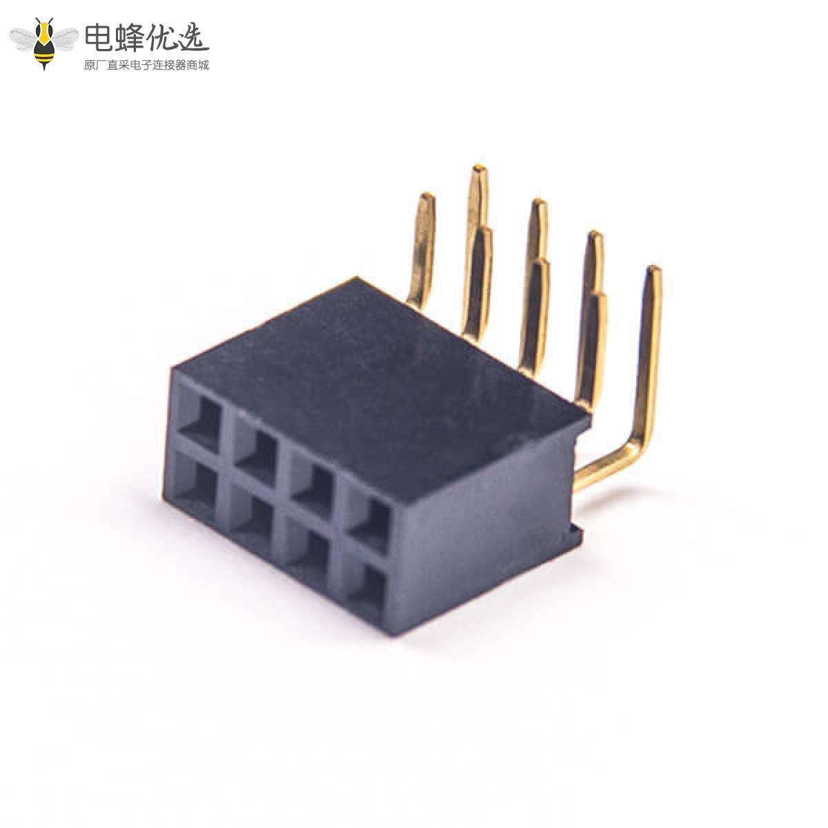 - 排母连接器,母头,弯式,90度,8Pin,2.54mm,双排,插板,Y型,焊接,镀金,黑色,H8.5mm,方形;